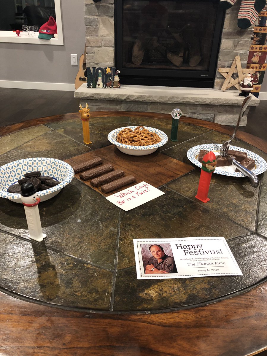 Great Festivus celebration! The pole was up, snacks were great, “Human Fund” cards handed out, and small show foods from other episodes. Couldn’t have had more fun!
