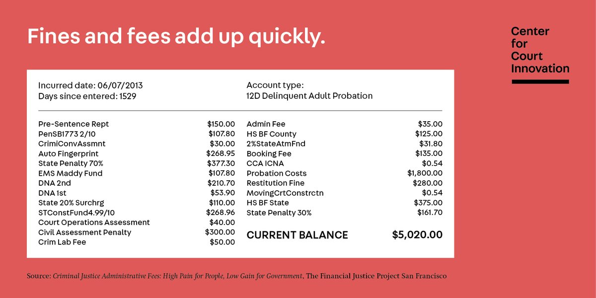 #finesandfees add up, some individuals are forced to choose between paying their court debt or their rent, bills, and childcare. Falling behind on payments may result in wage garnishment or jail. We create fairer alternatives: https://www.courtinnovation.org/fines-fees pic.twitter.com/c2lOVeRP7Z