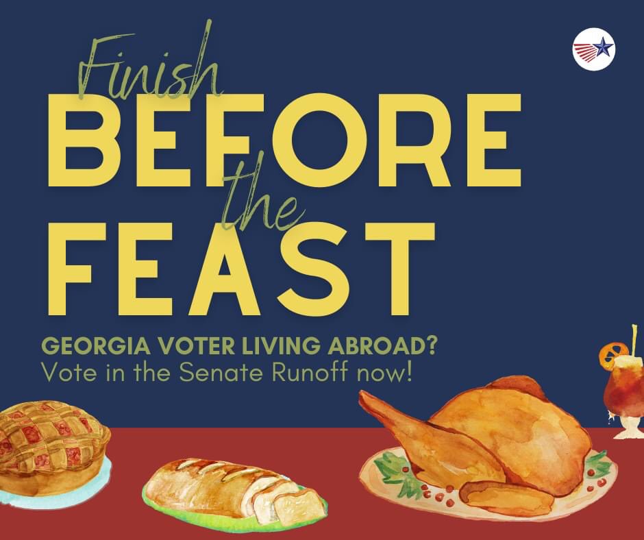 Attention #Georgia voters! It is incredibly important to complete/return your ballot ASAP! Mail will be delayed over the holiday season, so#DemsAbroad wants all#Georgians abroad to vote by#Thanksgiving!#FinishBeforetheFeast