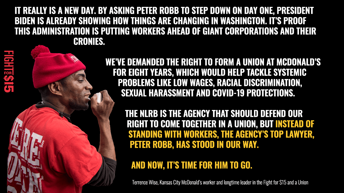 @SEIU2015 is standing with@fightfor15 to demand President-elect Biden must#FirePeterRobb and Trump appointees who pose a threat to union rights. pic.twitter.com/nlgoygo3Eo