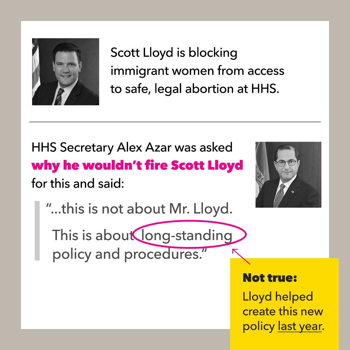 @SecAzar Stop with the lies. (Can anyone associated w/ this Admin. ever tell the truth?) Scott Lloyd created this policy which is denying women access to safe, constitutional, health care. This needs to stop & It is time to#FireScottLloyd & perhaps#FireSecAzar as well.https://twitter.com/PPact/status/985555967348756480 …