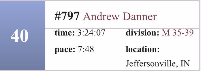 Not my best showing. Legs didn’t want to work after 16 miles, which made the last 10 pretty miserable. If I can take one positive from this, it’s that in 22 years of running, no matter how bad things have gotten, I’ve still finished every single race I’ve started.