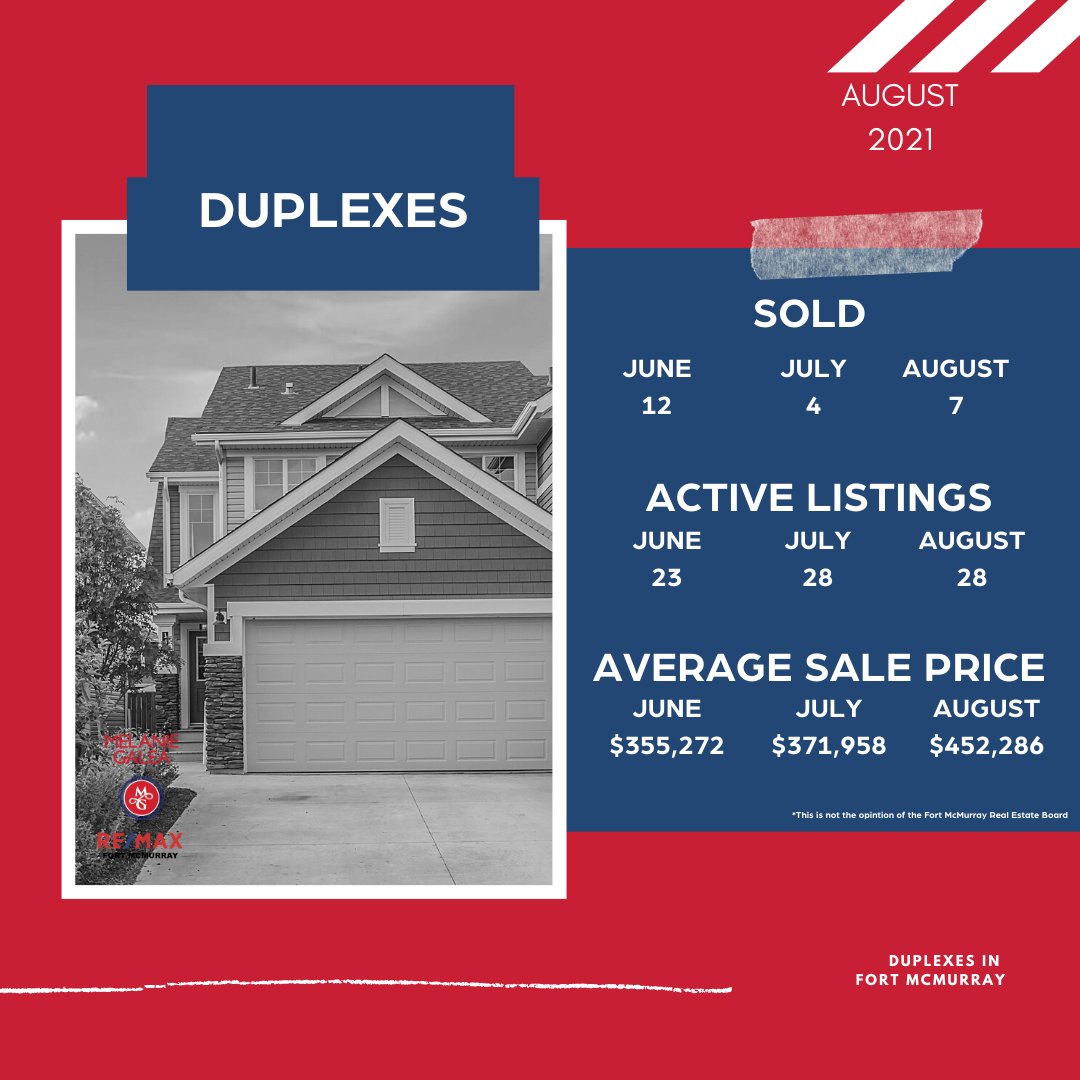 Duplex owner? Check it out! Here is your monthly update for the month of August. See what has been happening over the last three months in real estate in Fort McMurray. Visit http://www.fortmcmurraystats.com