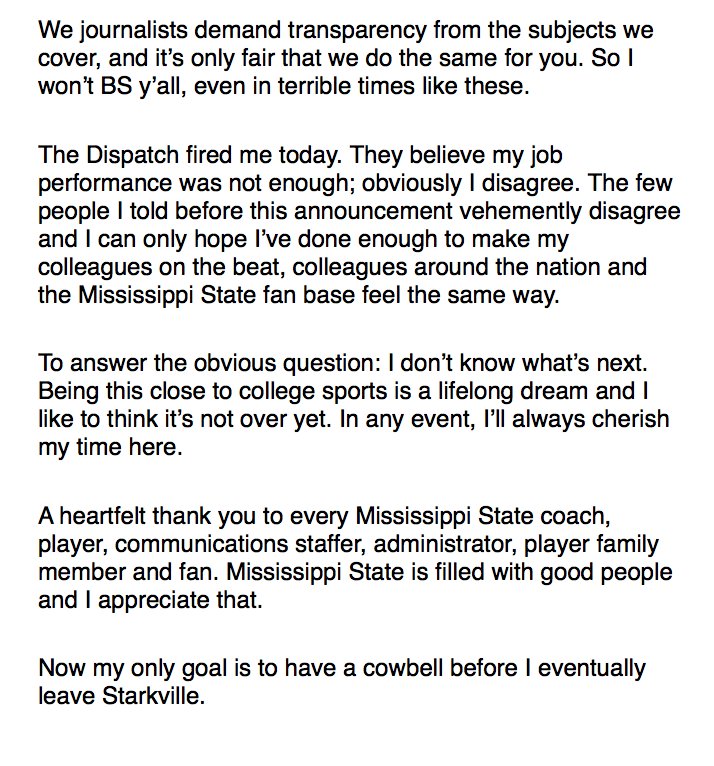 @Brett_Hudson was so good at his job that I saw 90% of his content but didn’t follow him. Great coverage of MS State athletics. No self respecting journalist would take the beat@CDispatch after a baseless termination#FreeBrettHudson