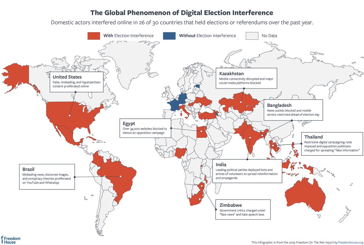 #FreedomontheNet 2019 report. Digital manipulation from domestic actors observed in 26 of 30 elections. 15 countries rolled out new social media surveillance programs. But hey, some good news -