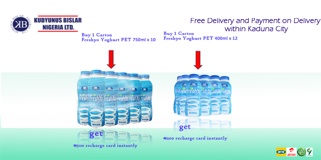 Freshyo Promo!!! Buy 1 Freshyo 400ml get N200 recharge card instantly. Buy 1 Freshyo 750ml get N300 recharge card instantly. Offer ends 25th June 2018. To place order, click the website link below http://www.kudyunusbislar.com.ng