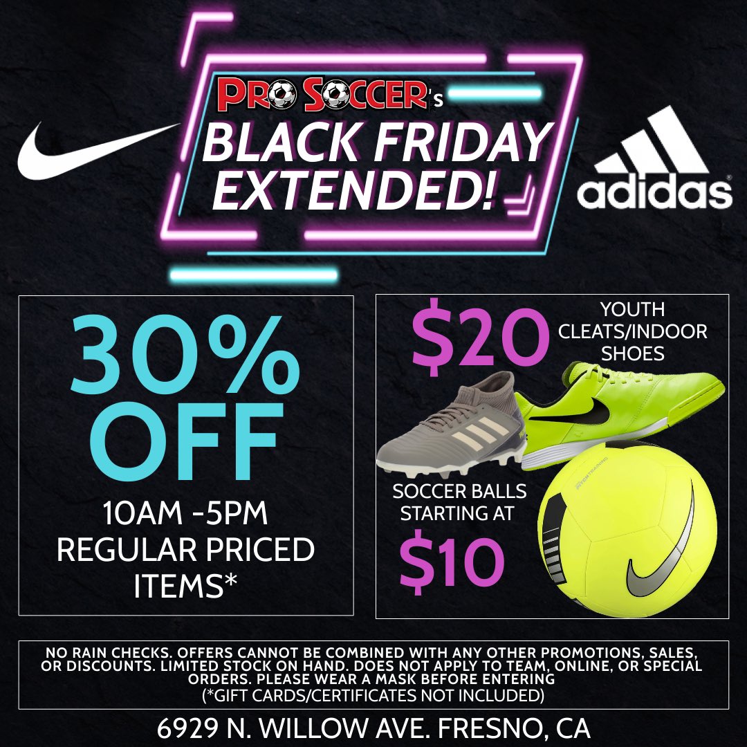 Black Friday has been extended into the weekend: Regular priced items are 30% off! $20 Youth cleats and indoor shoes. We’re open until 5pm today. 6929 N Willow Ave Ste. 109