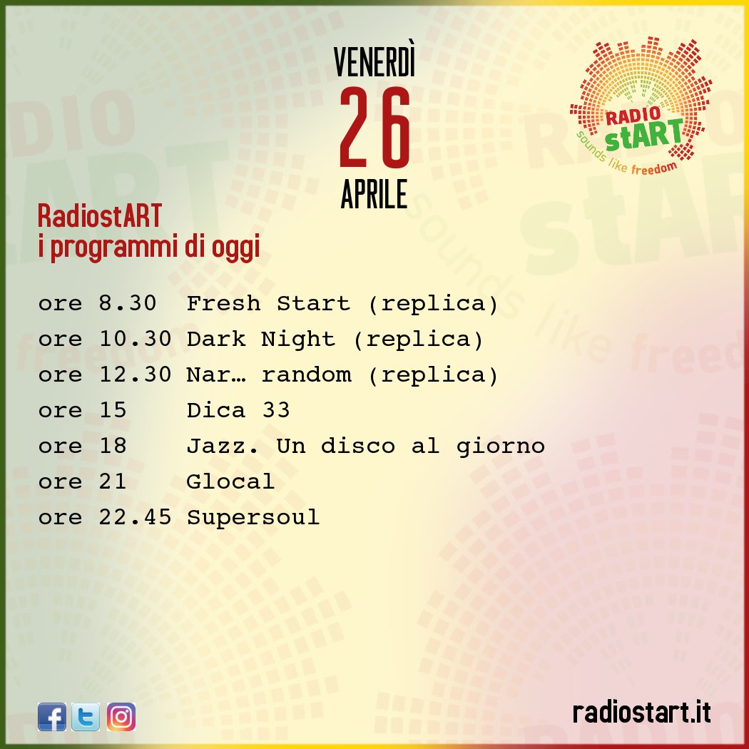#RadiostART#Programmi#Podcast#OnAir#Repliche#Dica33#jazzundiscoalgiorno#Glocal#Supersoul#Radio#Musica#Venerdì#Friday#April26#26Aprilepic.twitter.com/2Htg5c7bq9
