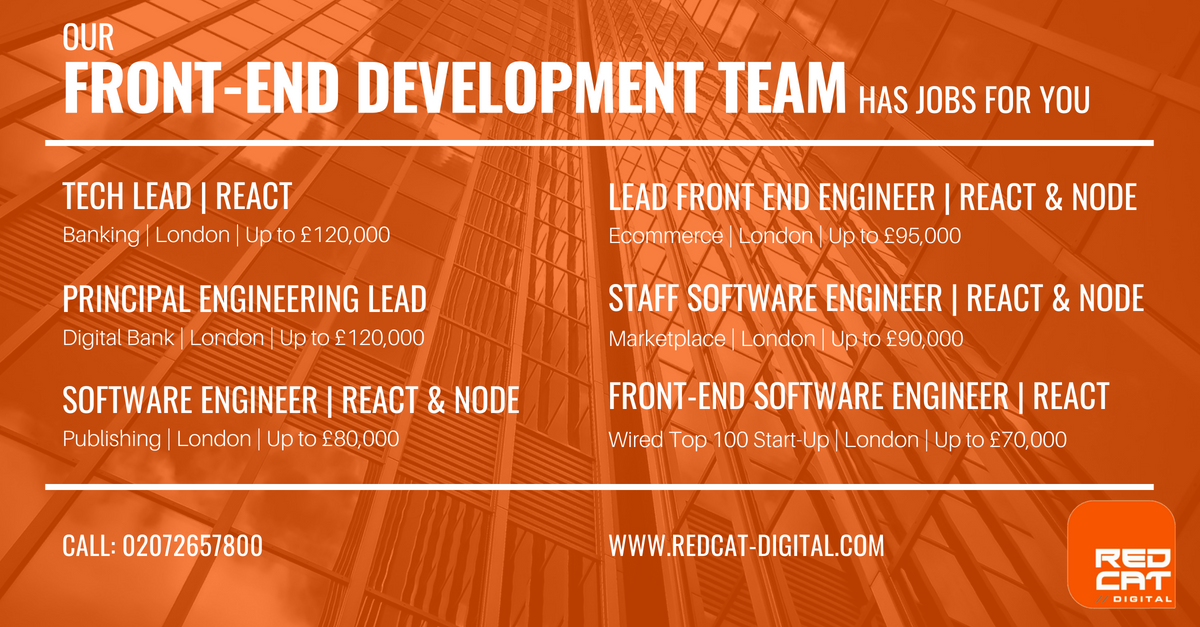 It's #FrontEndFriday! This week our#FrontEndDev team have 6 new roles on offer! Want to workin#Ecommerce? Great. How about in#Digital Banking? Even better! Whatever the case, we have#jobs for you. Call a consultant on 0207257800 or apply online https://buff.ly/2pikfvv pic.twitter.com/qIKqtUNWM1