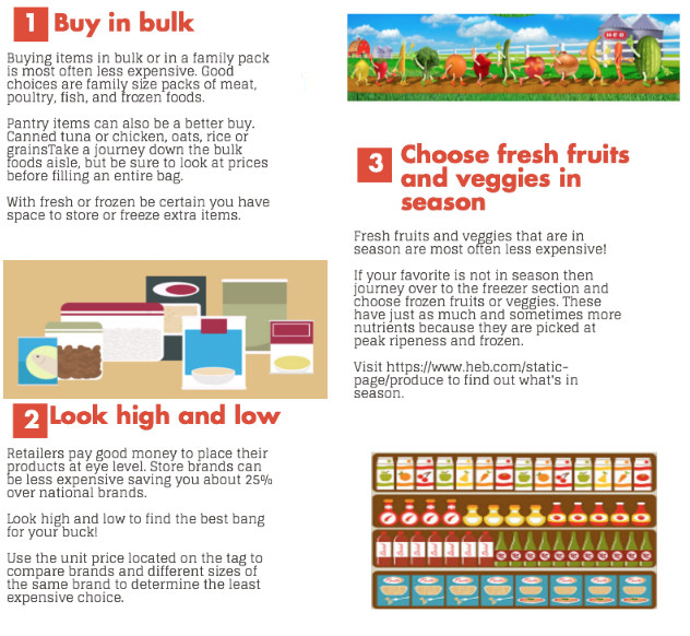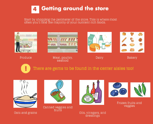 Check out this infographic on tips for grocery shopping! Make a list with your parents and go shopping with them. Remember to look for staples to have daily (snacks, bars, fruits, etc).