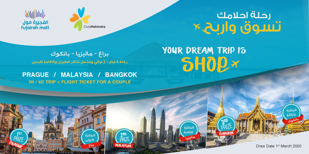 Shop & Win your dream trip to prague , malaysia or Bangkok all you need to do is shop at Fujairah mall outlets. term & Condition apply. تسوق واربح رحله الأحلام إلى براغ ماليزيا بانكوك كل ماعليك للفوز ان تتسوق بمحلات الفجيرة مول تطبق الشروط والاحكام.