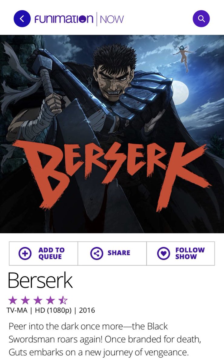 #Funimation also has Goblin Slayer (rape in ep. 1, women meat shields by ep. 12) RIN (all sorts of fucked up shit, gore, and guro pretty sure) and Berserk (do I need to describe what’s in Berserk? Rapehorse, Troll baby pregnancies?) “outside our standards”