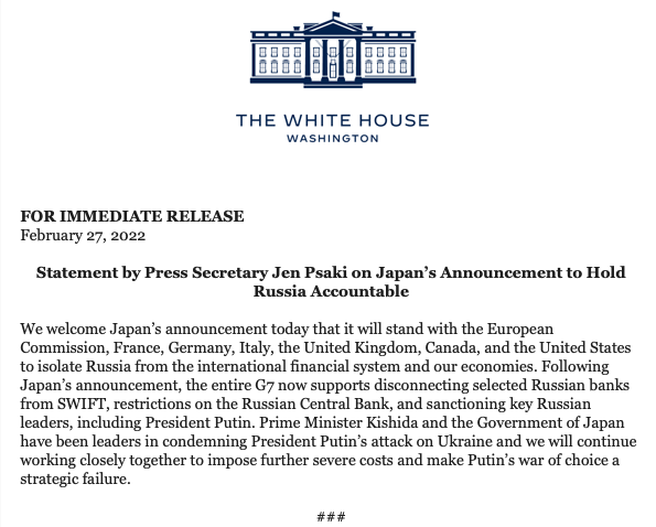 #G7 "now supports disconnecting selected Russian banks from SWIFT, restrictions on the Russian Central Bank, and sanctioning key Russian leaders..." says@PressSec in a statement.pic.twitter.com/CAbcUCwBIv