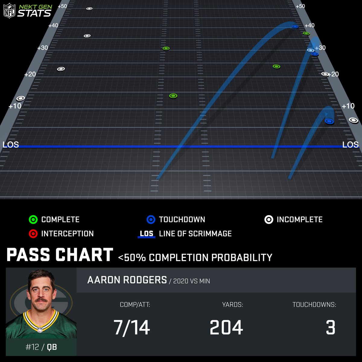 #Packers win, completing 7/14, 204 yards & 3 TD on attempts that had less than a 50% completion probability. All three TDs were under 30% probability and targeted a receiver outside the numbers.#GBvsMIN |#GoPackGo