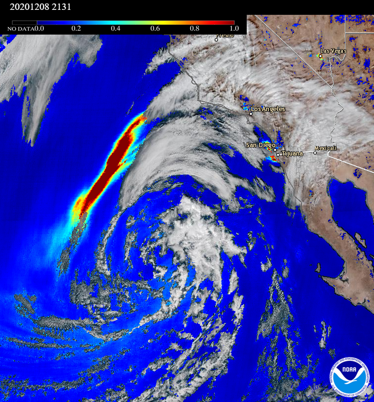 #GOES17#ABI captured this spectacular aerosol optical depth (AOD) composite overlaid on GeColor from the AerosolWatch website, showing#smoke wrapping around low pressure in the Pacific today (8 Dec). Smoke originated from#wildfires in northern#BajaCalifornia, near Tijuana.pic.twitter.com/hjK0qo0A6r