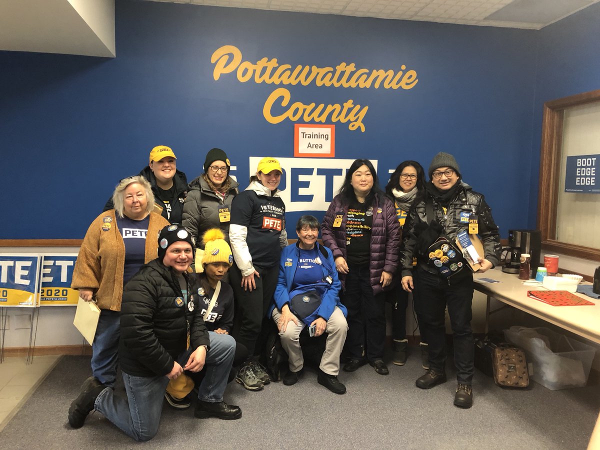 #GOTC in Council Bluffs, IA. All pictured here traveled into Iowa from VA, NY, MD, on their own dime to help Pete#WinTheEra.@WhyKelly2@ForrestWinslow@PhillipandI@SWVAforPete@mpage_rn@RedCatNewYorkerpic.twitter.com/ZMuIgv8Ted