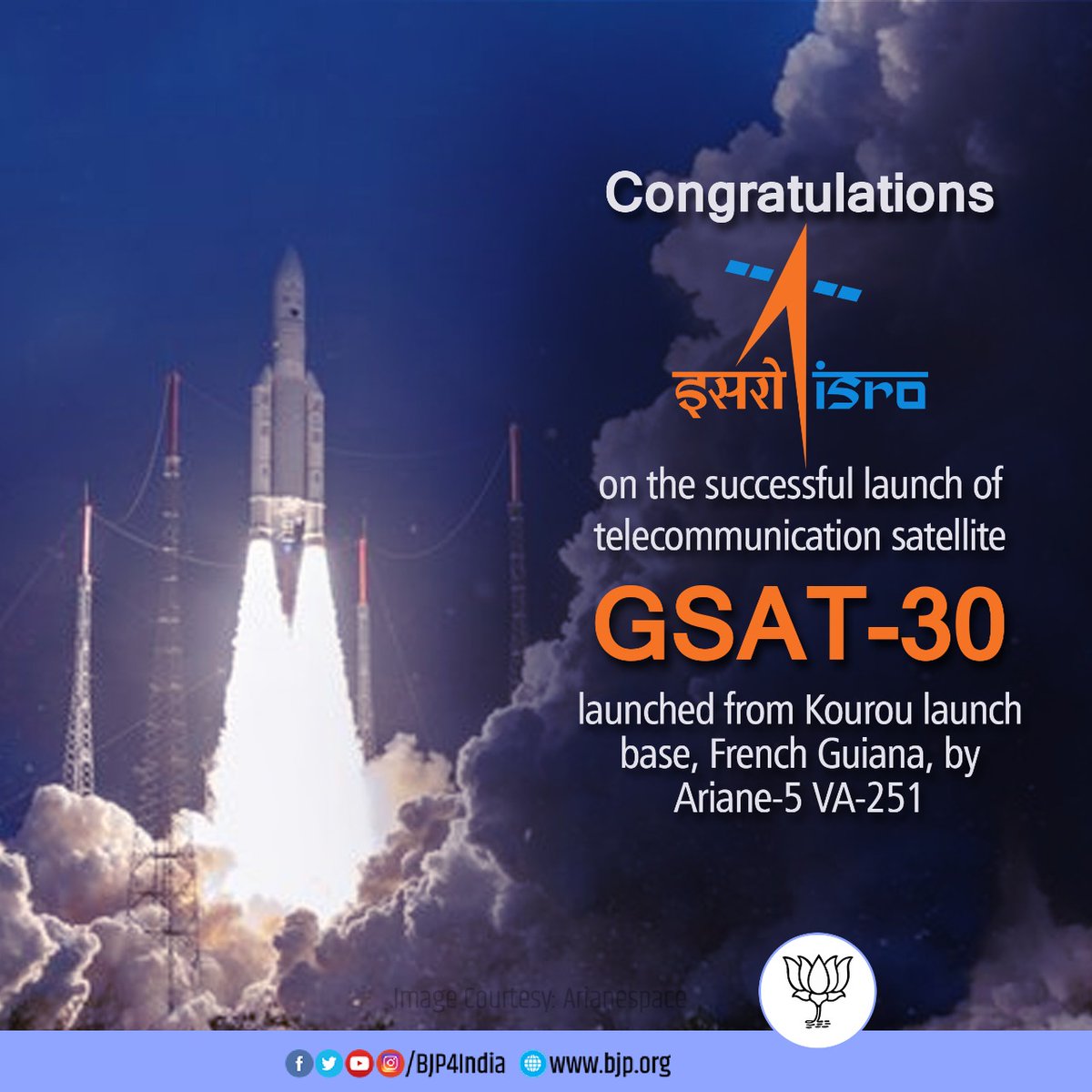 @isro for the successful launch of#GSAT30 into a Geosynchronous Transfer Orbit by#Ariane5#VA251. Another feather in the cap. Best wishes for the future!pic.twitter.com/r8NuW4y8Rk
