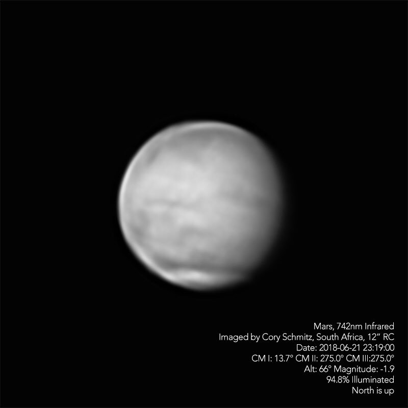 #Mars in 742nm infrared from a few days ago. I was surprised by the amount of surface detail that showed up in IR, as the visible spectrum was a bit bleak (#duststorm). Ten minutes of derotation in WinJUPOS from four 2-minute captures.#astrophotography#gameofplanets pic.twitter.com/ONjyWnbMoI