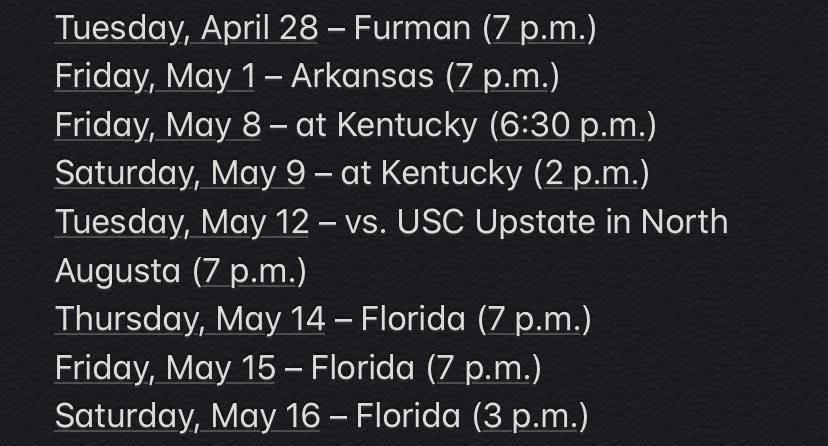 #Gamecocks NEXT WEEKEND'S SCHEDULE: Friday: 4 p.m. Saturday: 2 p.m. Sunday: 12 p.m. pic.twitter.com/A8XoqmFU17