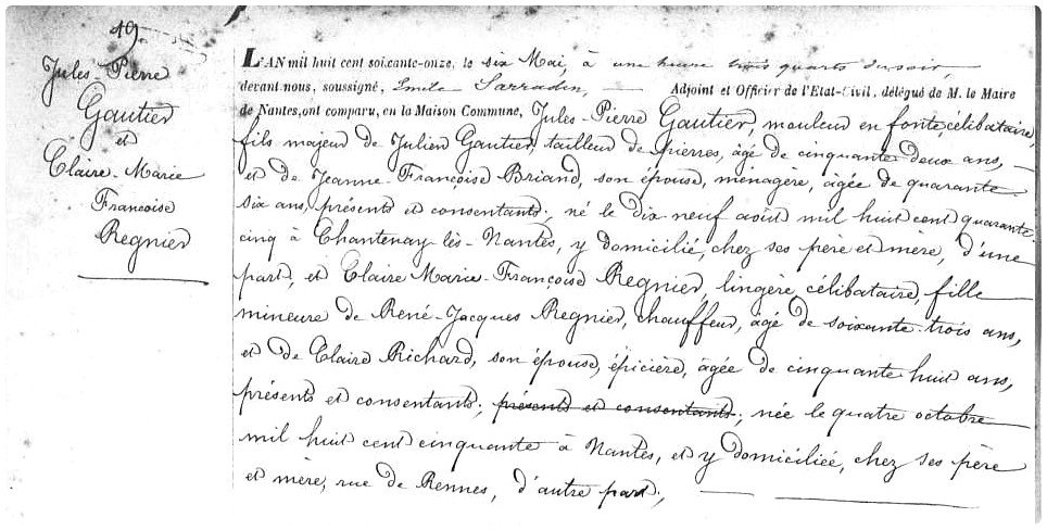 #Généalogie |#1J1Ancêtre#Nantes, le samedi#6mai 1871, l'officier de l'état civil du 1er canton marie mes aïeux Jules Pierre#GAUTIER et Claire Marie Françoise#REGNIER (Sosa 38 & 39 Gen6). Jules est mouleur en fonte et Claire est lingère. Ils resteront mariés 43 ans.pic.twitter.com/FD2HCX1D9O