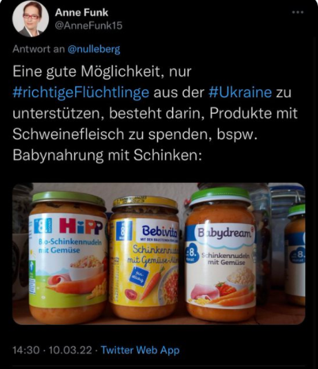 #AfD-Politikerin Anne#Funk erklärt mal eben#jüdische und#muslimische#Geflüchtete aus der#Ukraine zu "falschen Flüchtlingen"#noafd#fckafdpic.twitter.com/VnGwVvoP8O