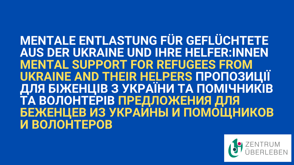 @ZentrumUE finden#Geflüchtete aus der#Ukraine sowie ihre haupt- und ehrenamtlichen Unterstützer:innen psychosoziale und fachliche Beratungen sowie Schulungen zur traumasensiblen Arbeit und Selbstfürsorge. Alle Infos auf DE/EN/UKR/RU: https://www.ueberleben.org/neuigkeiten/aktuelles/ukraine-angebote/ …pic.twitter.com/GxLqNbojra
