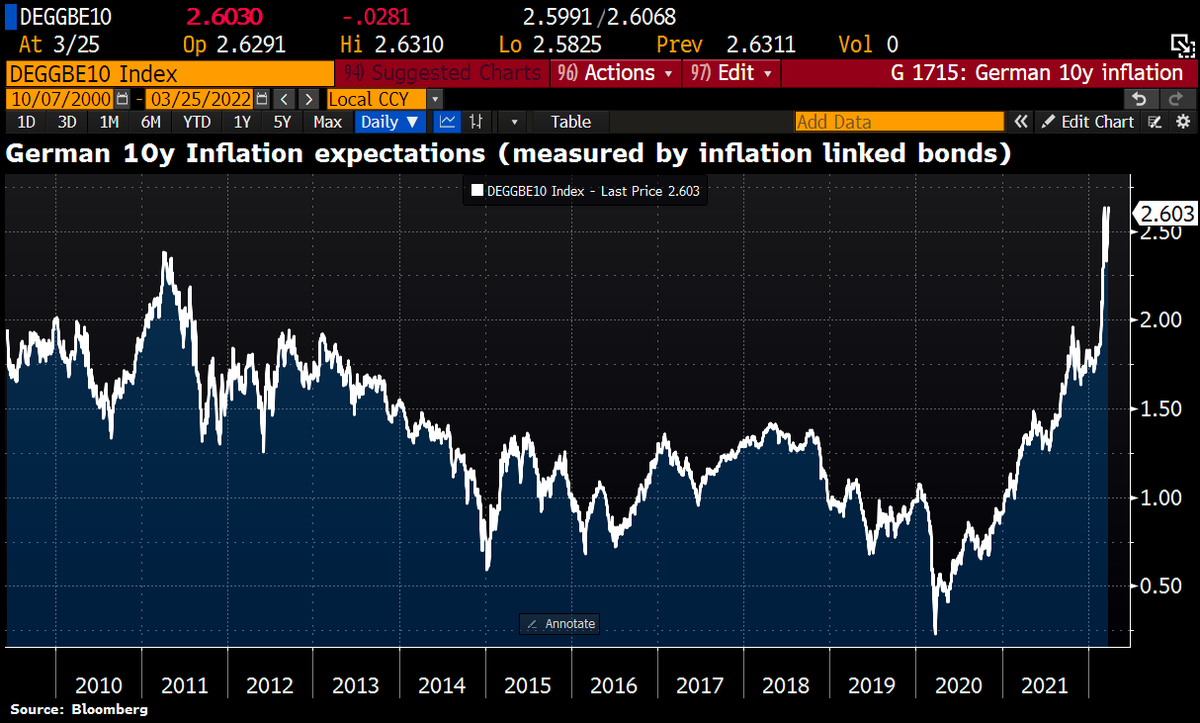 #Germany where inflation expectations keep rising. German 10y inflation expectations measured by linkers hit fresh ATH at 2.64% this week. New inflation figures are due next week, which could show a 7 before the decimal point. pic.twitter.com/22VOhqb5DM