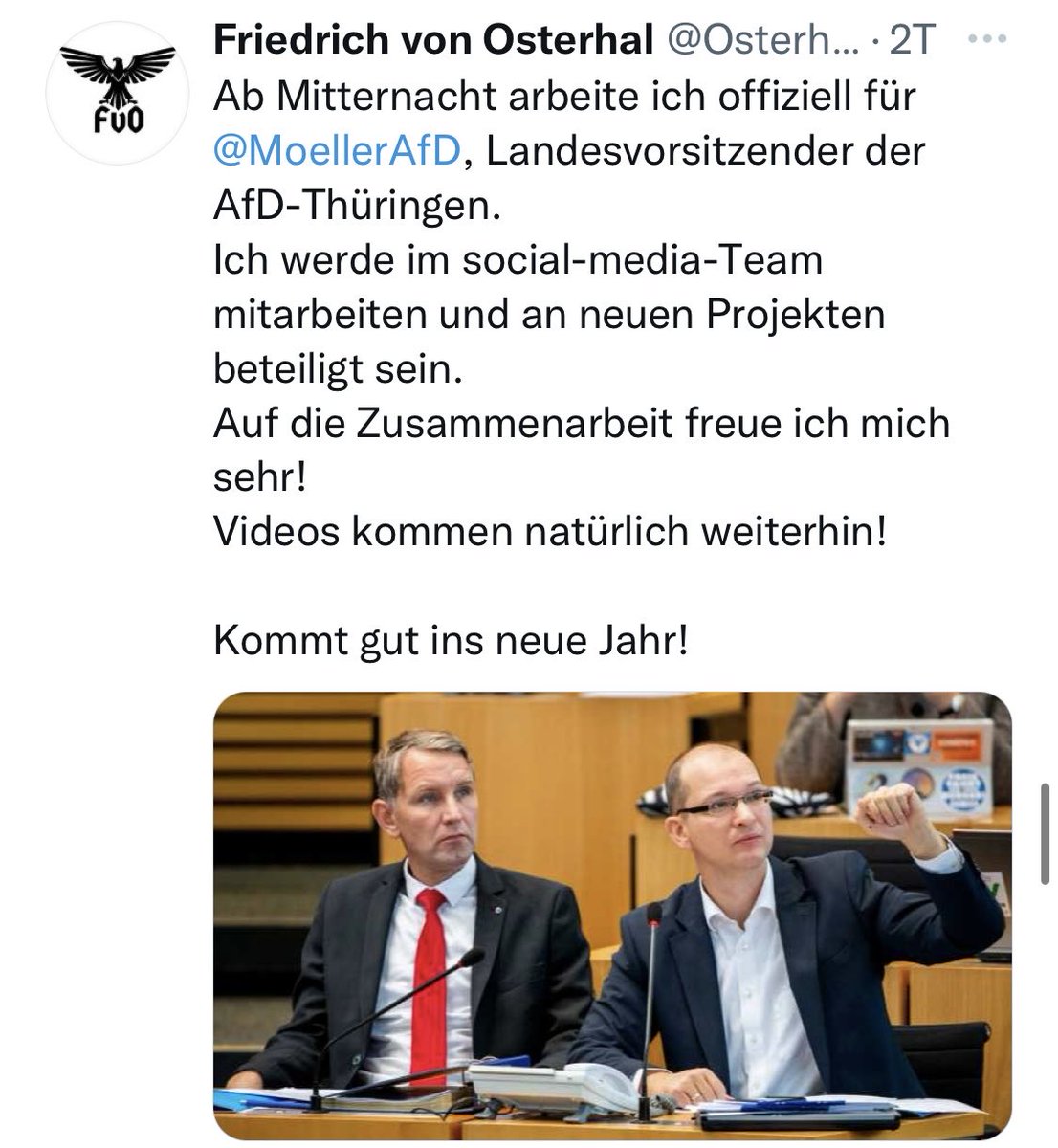 #AfD Thüringen beweist erneut ihren aggressiven#Geschichtsrevisionismus: Im Social-Media-Team von Landessprecher#Möller arbeitet nun ein extrem rechter Propagandist, der mit Reichsadler-Profil im#NS-Stil für sich wirbt und zu Neujahr mit#Reichsflagge grüßt.pic.twitter.com/uUeus6d0jZ