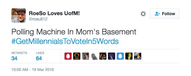 #GetMillennialsToVoteIn5Words Just look at this guy https://twitter.com/markdice/status/711334411749359616 …This Tweet is unavailable. -