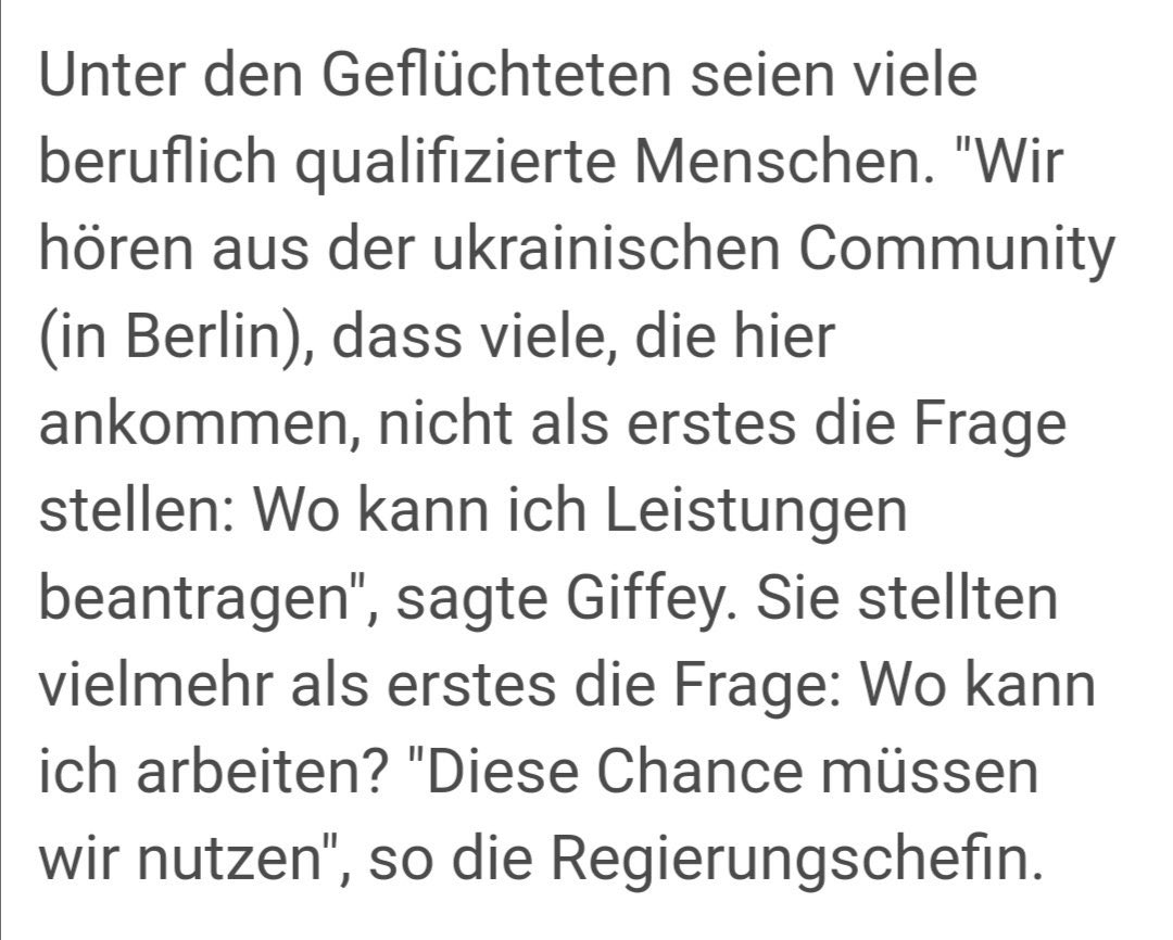 #Giffey, dass die Ankommenden arbeiten wollten und "nicht als erstes die Frage stellten: Wo kann ich Leistungen beantragen", macht sprachlos. Ein Schlag ins Gesicht all derer, denen seit Jahren der Zugang zum Arbeitsmarkt erschwert wird. https://www.zeit.de/news/2022-03/17/giffey-wirbt-steigende-fluechtlingszahl-als-chance-sehen …Show this thread -