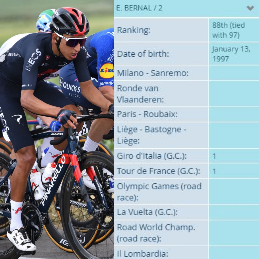 24-years-old and Bernal has a Tour and Giro title to his name - madness. If he takes the Vuelta later this year he'll become the youngest rider in history to complete the historic triple - even more madness. El Campeón