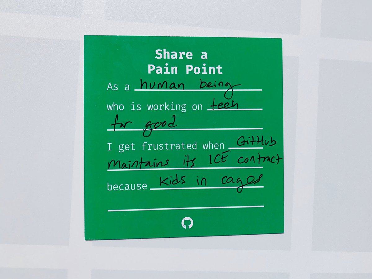 #GitHubUniverse conference,@github users keep adding pesky#GitHubDropICE bug reports on the public suggestions wall.#NoTechForICE!pic.twitter.com/ggmK9cJ8yF – mjesto: Palace of Fine Arts Theater