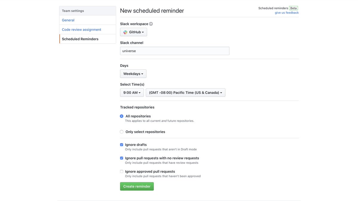 Keep your projects moving with scheduled reminders. Send Slack notifications for pending code reviews to the channel of your choice and avoid missing important reviews. Sign up today for the beta. Available to all in the coming months. https://github.com/features/reminders/signup …