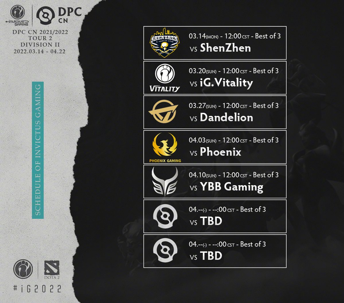 #Dota2] - DPC CN 2021/22 Tour 2 Division 2 Our journey in the Dota Pro Circuit begins tomorrow! Check out the schedule, because you wont want to miss a single game!#GoInvictus pic.twitter.com/L3vSByB6ui