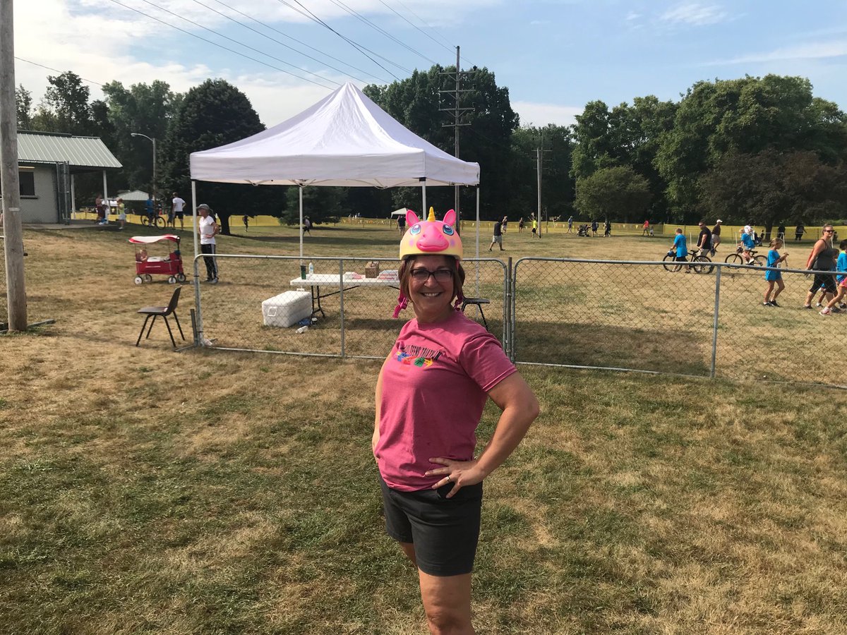 Principal Shreiner Donns a rainbow Brite helmet(thanks Violet) to display the proper bike safety protocols at today’s kids triathlon. Thank you GPRD and Kerry’s Kids for offering this great event. Many Goshen schools volunteers.