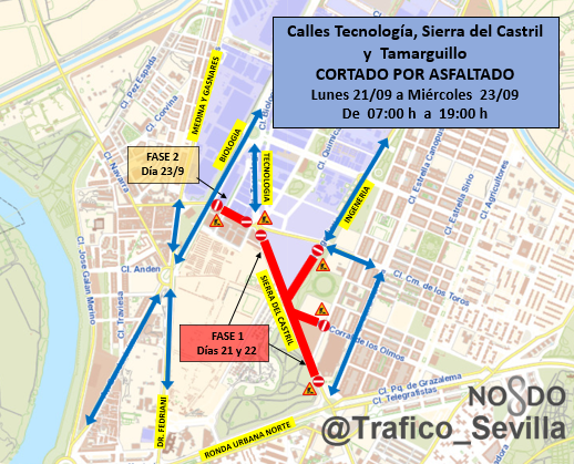 de #tráfico por asfaltado de las calles Tecnología, Sierra del Castril y Tamarguillo, los días 21, 22 y 23 de septiembre. Atentos a la señalización.@Ayto_Sevilla#Gobernacion#SevillaHoy@EmergenciasSevpic.twitter.com/RW3oHi64lt