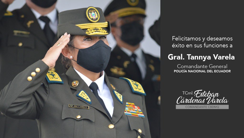 #GralTannyaVarela por su designación como la primera Comandante General de la@PoliciaEcuador. Estamos convencidos que la generación de espacios para la mujer constituye un gran paso y avance en el desarrollo de las instituciones uniformadas.#BomberosQuitopic.twitter.com/K5dL37JYmH