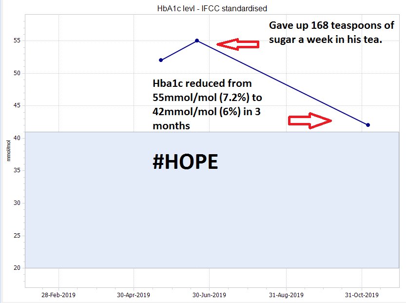 #GraphOfTheWeek goes to my pt who gave up 168 teaspoons of sugar in his tea a week. In 3 months of T2D diagnosis he is in remission figures & is so happy! Consent2share#DiabetesAwarenessMonthpic.twitter.com/iYjNPJuZGx