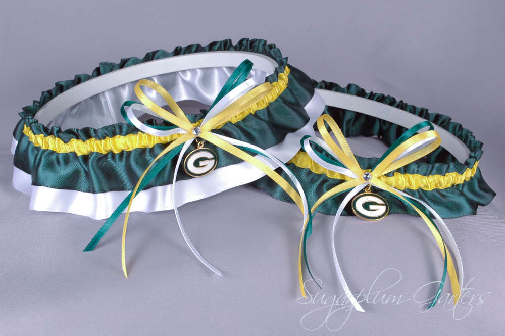 In the shop: a Green Bay Packers wedding garter set in yellow, green, and white satin by Sugarplum Garters. The set includes a garter to keep and another to toss. Get it here: http://etsy.me/2wY0jDL !