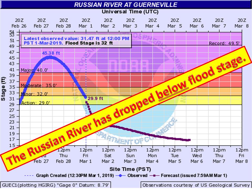 #RussianRiver at#Guerneville fell below flood stage 32.0 ft after reaching a crest of 45.38 ft Wed evening. Waters will continue to recede through tonight and then continue a gradual recession through early next week.#cawx#Guernevilleflood#floodpic.twitter.com/zjsUwQaXUU