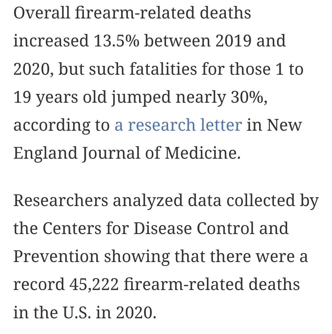 “Gun deaths were the leading killer of US children in 2020” Increased by 30%. Don’t understand why US parents aren’t crying out got something to be done. It’s preventable death. The charts are shocking