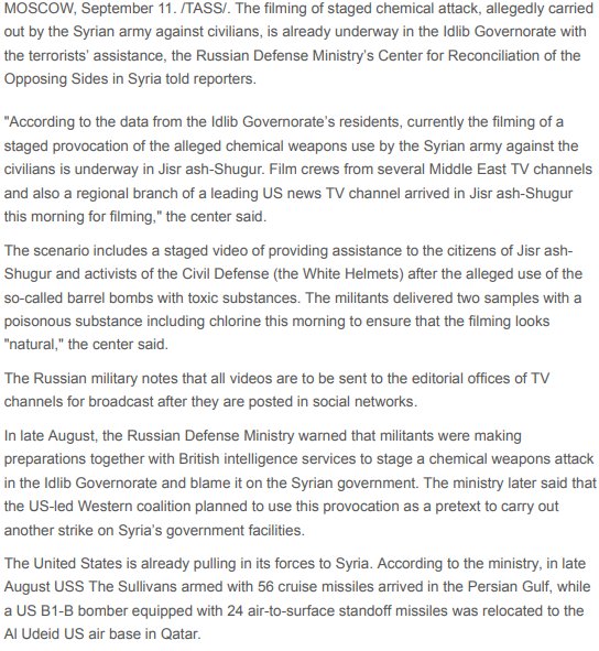 #HappeningNow: Russia's@mod_russia warns that filming of staged#chemicalattack in#Idlib's Jisr ash-Shugur is underway by#WhiteHelmets activists, crews from several Middle East TV channels and a regional branch of a leading US news TV channel
