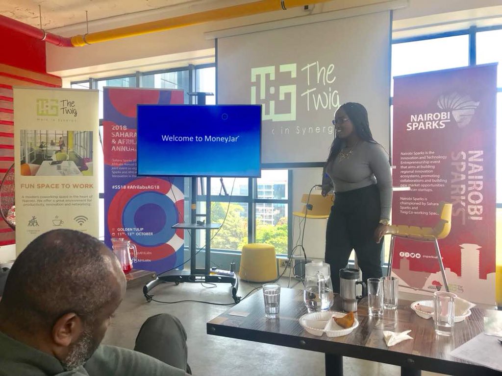 #HappeningNow on stage is MoneyJar a online portal that helps the community with wealth management i.e. financial savings and management with over 980 users who upto 73% successfully reach their target of saving finances#womenintech#innovationinthedataage#Nairobisparks18pic.twitter.com/hnUuESOaOt