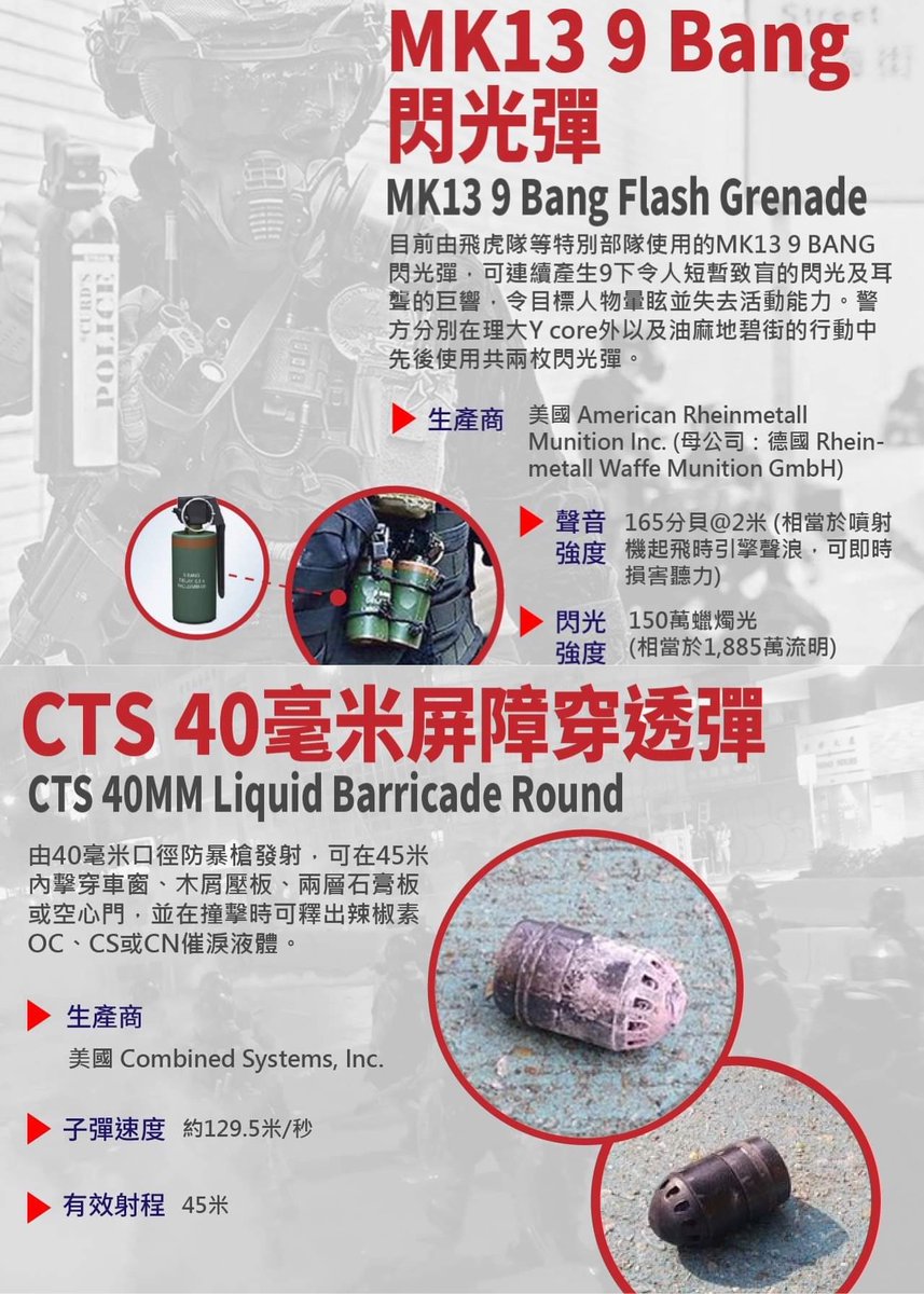 #hkpolice has deployed a list of new weapons in recent crackdowns on#HongKongProtests. They are imported from US, Switzerland, Canada & Germany. We urge those countries to stop selling weapons to#HKGov, which are currently used in suppressing#Hongkongers.pic.twitter.com/n1LMzabDyy