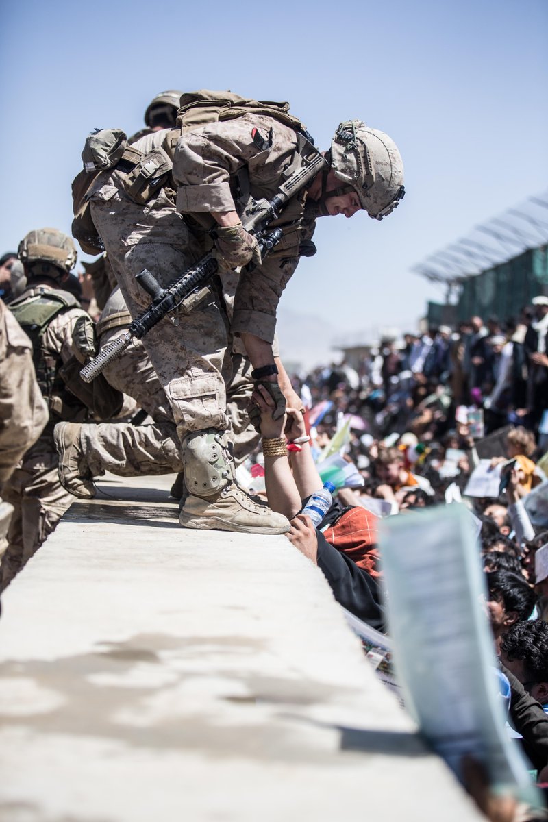 @USMC Marine assists a woman and child during an evacuation at Hamid Karzai International Airport in Kabul, Afghanistan.#HKIA pic.twitter.com/kVuU1aogXf