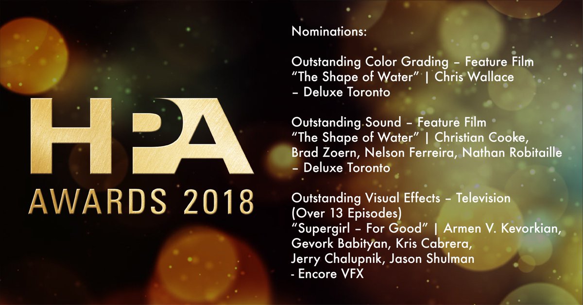 @HPAonline Awards nominees, especially our@DeluxeToronto (nominated for#sound and#color work on#TheShapeOfWater) and@EncorePost (nominated for#VFX work on#Supergirl) teams. Looking forward to tonight!