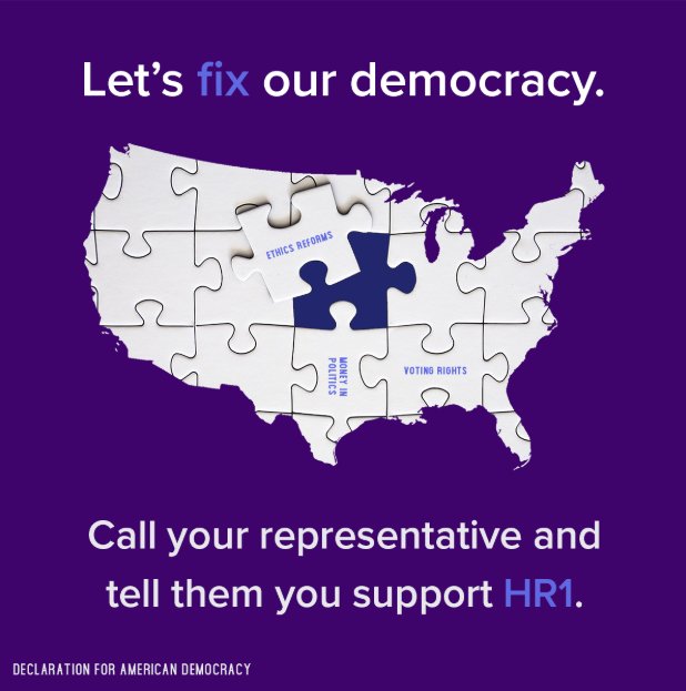 #HR1 has three key areas of reform: voting and election laws, campaign finance and ethics. Enacting these changes would restore faith in our democracy and put power back in the hands of the people. The Senate should bring it up for a vote NOW! -