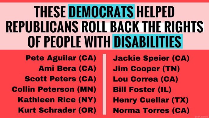 #CorporateDems that voted w/ Republicans to gut the#ADA. Businesses won’t bother with making their facilities accessible, marginalizing people with disabilities even more. Half of the Dems to vote for#HR620 were from CA! The American people are done with#DINOspic.twitter.com/YRyCdUM2b0