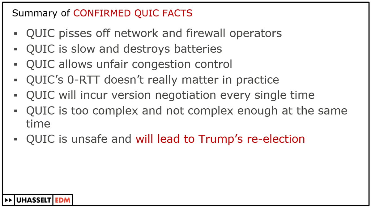 #QUIC and#HTTP3: Too big to fail?!". You can find the slides at: https://quic.edm.uhasselt.be/files/QUIC_TooBigToFail.pdf … …. Sadly, it was not recorded, but if you're running a conference, I would certainly be willing to come and give the talk again ;)pic.twitter.com/5vs8iaOlkW
