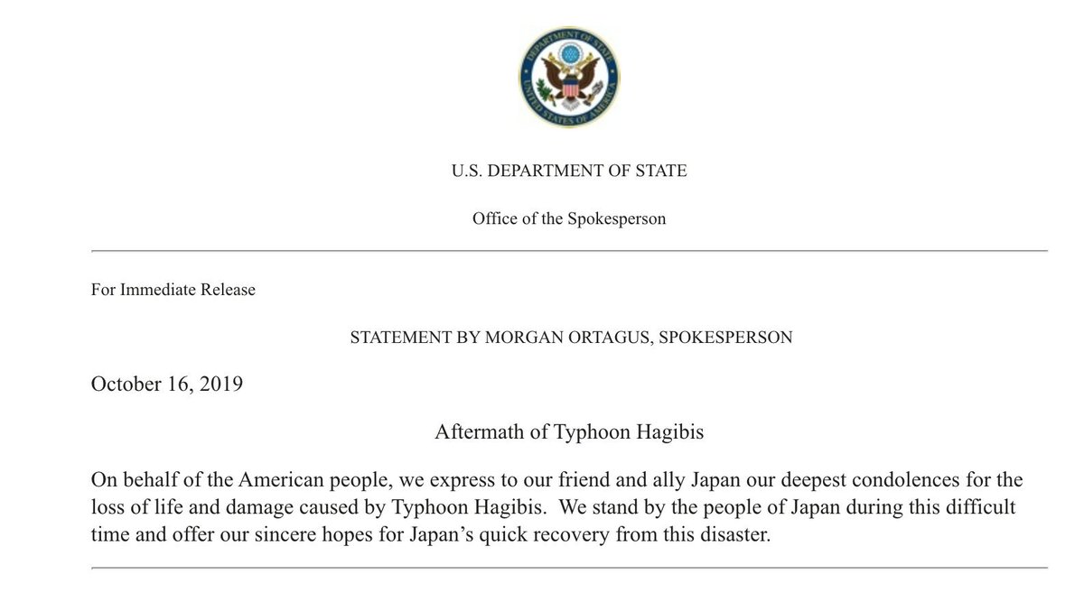 #Japan for the damage and loss of life caused by Typhoon#Hagibis. We stand by the people of Japan and offer our sincere hopes for Japan’s quick recovery. http://go.usa.gov/xVJhu pic.twitter.com/rhqDivGvZX